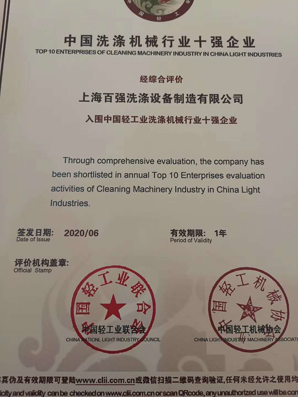 本次會(huì)議還經(jīng)行了十強(qiáng)企業(yè)授牌儀式,上海百強(qiáng)洗滌設(shè)備制造有限公司再度入圍中國輕工業(yè)洗滌機(jī)械行業(yè)十強(qiáng)企業(yè)!